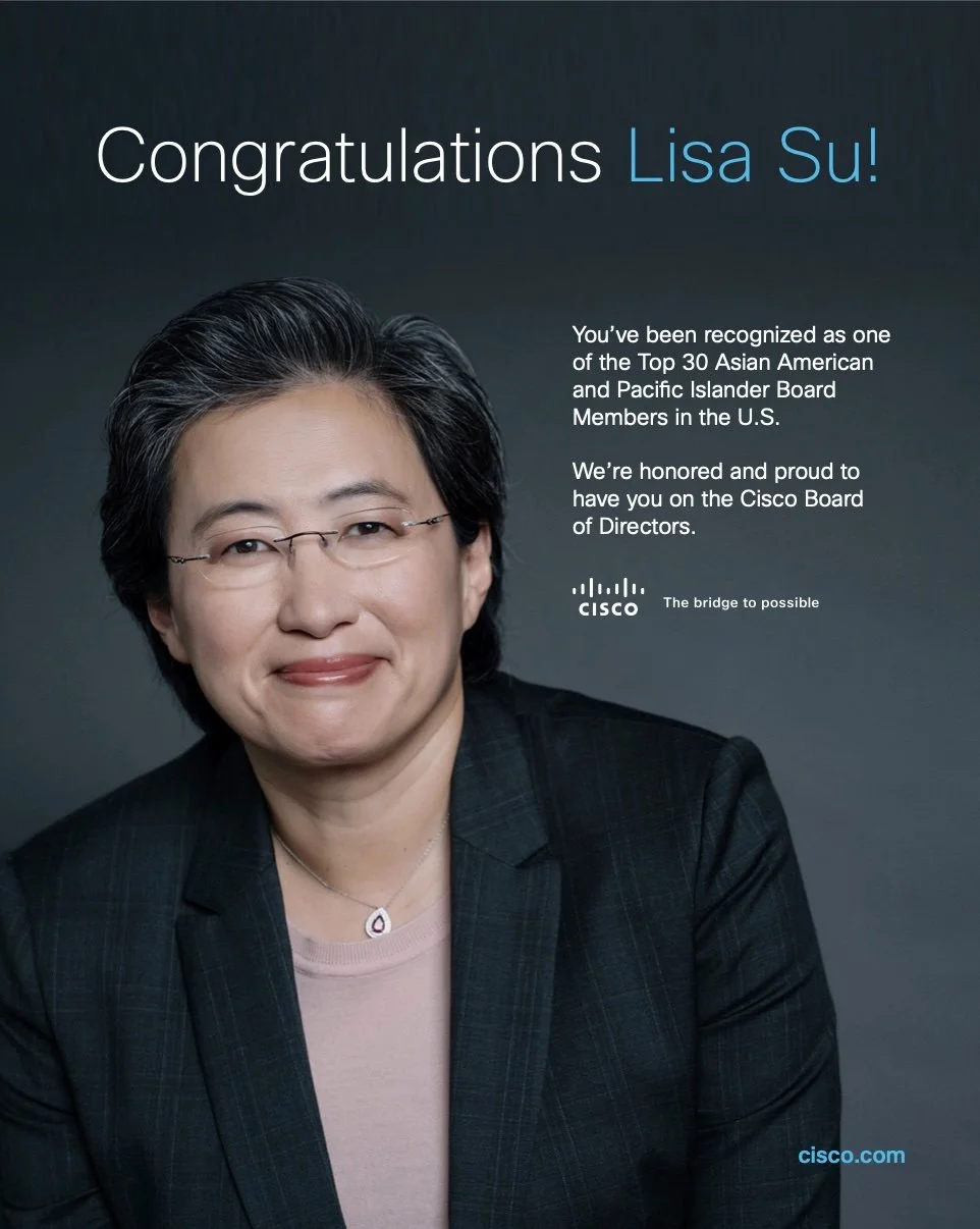 To celebrate Cisco board member Lisa Su being named one of the Top 30 Asian American and Pacific Islander Board Members in the U.S., I led the strategy and execution of a high-impact digital ad in Board Recruitment, a premier e-publication reaching over 60,000 institutional investors, board members, and C-suite leaders.