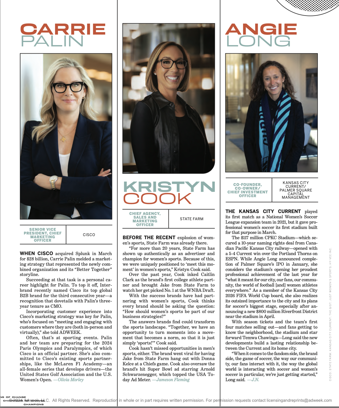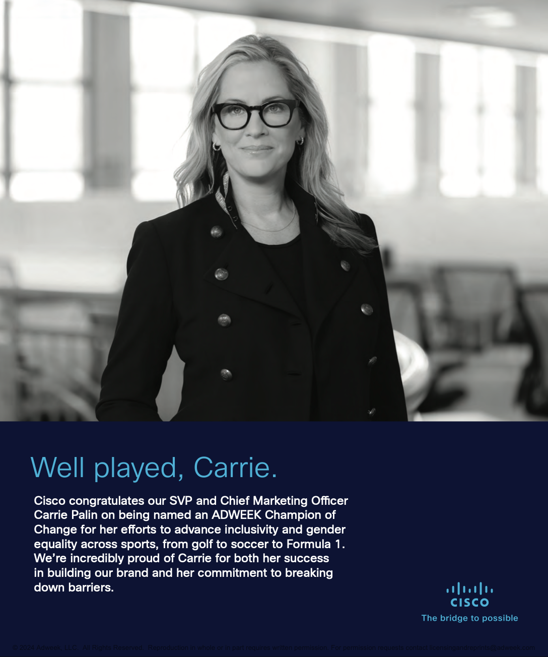 I had the amazing opportunity to collaborate across PR, executive comms, media, and creative teams to help feature Cisco’s CMO, Carrie Palin, in Adweek’s Special Edition Cannes Issue, released June 13, 2024. Carrie was featured three times in the issue—including a spotlight in “Champions of Change,” honoring women and nonbinary executives reshaping the future of sports.